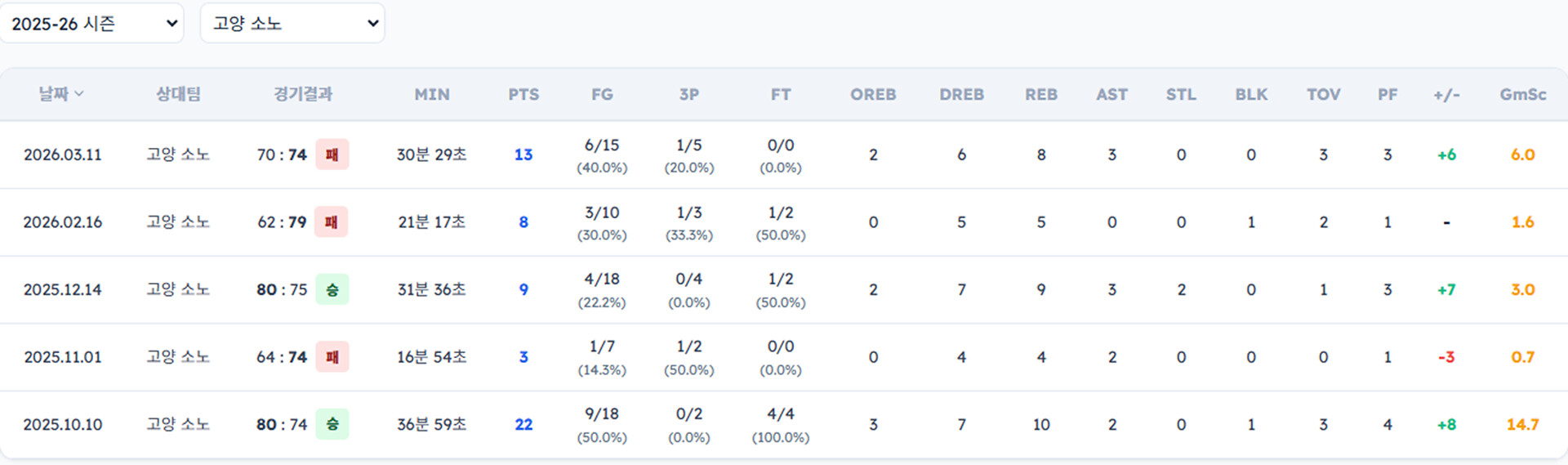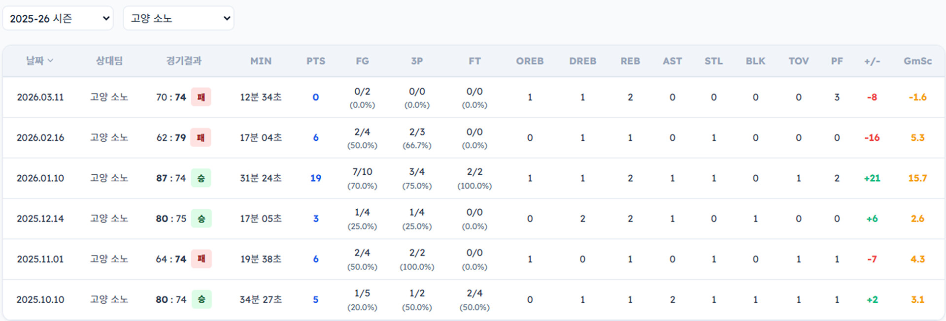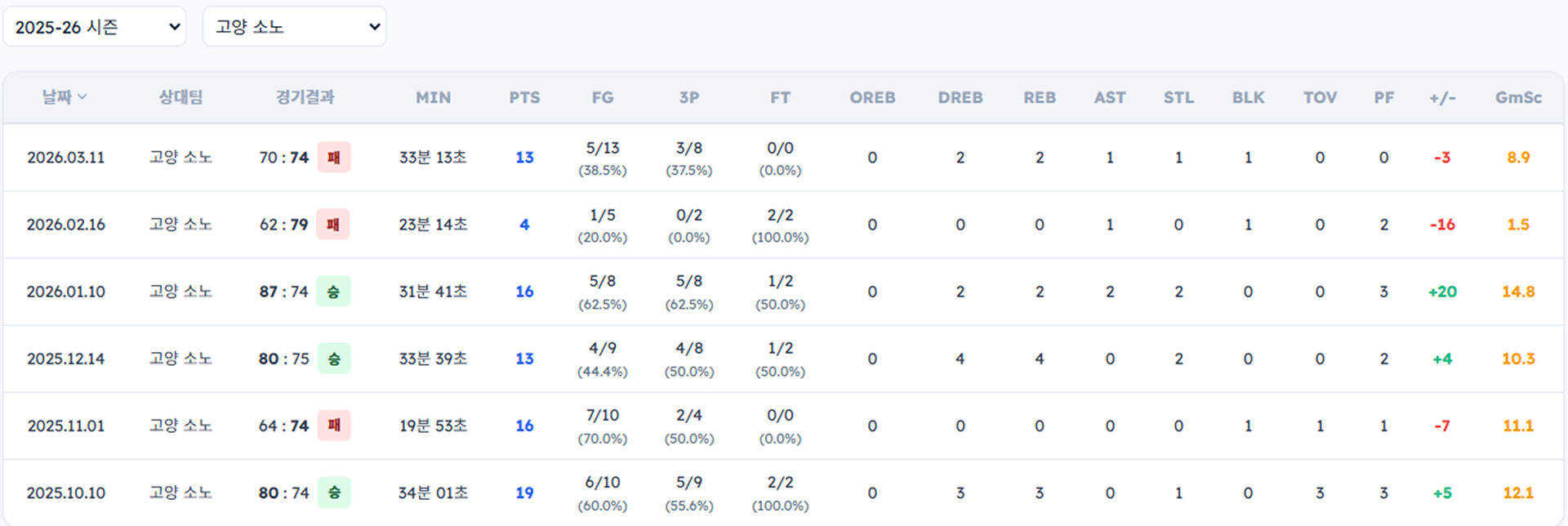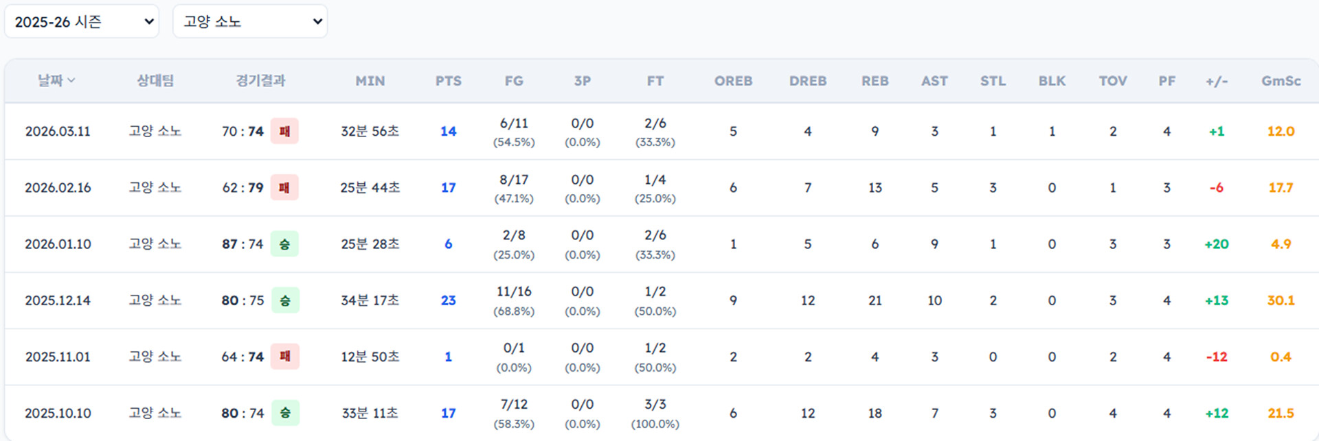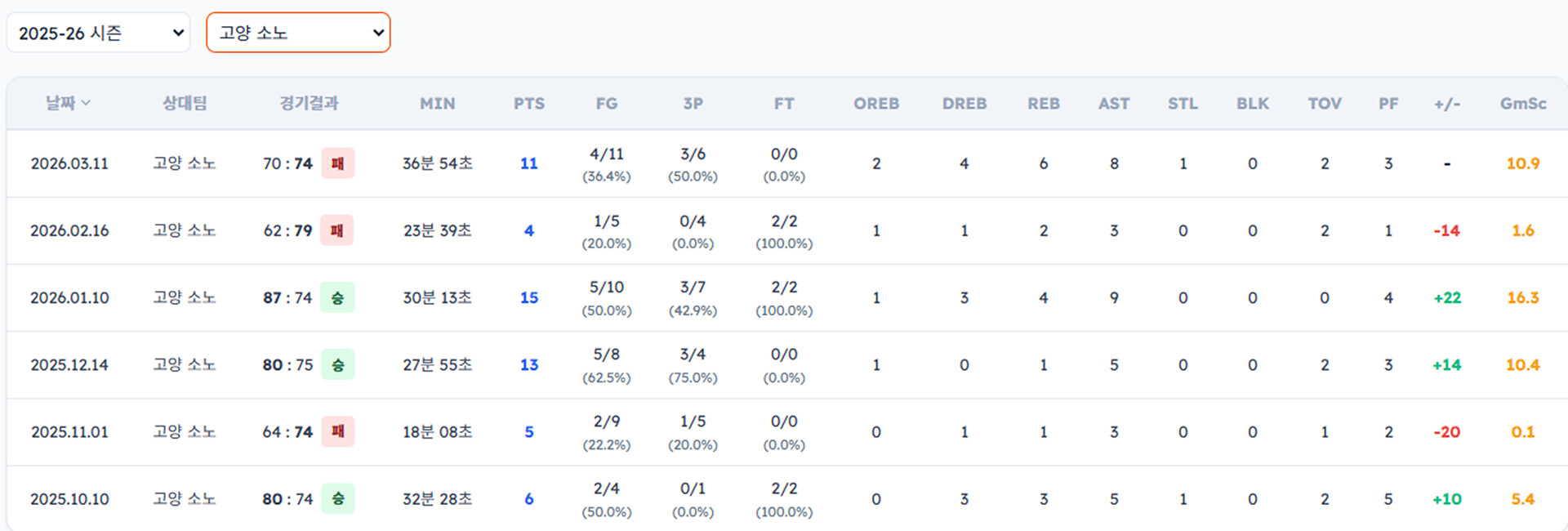 아래는 선수별 소노 상대 일자별 기록