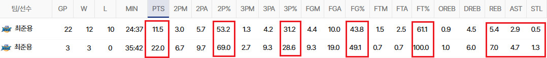 평균 22득점, 7리바운드, 4.7어시스트입니다.