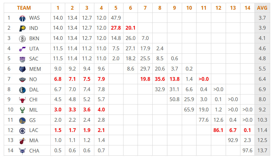 NBA 플레이인 토너먼트에서 탈락한 4팀의 드래프트 로터리 순위는 정규시즌 승률(성적)을 기준으로 결정됩니다.
