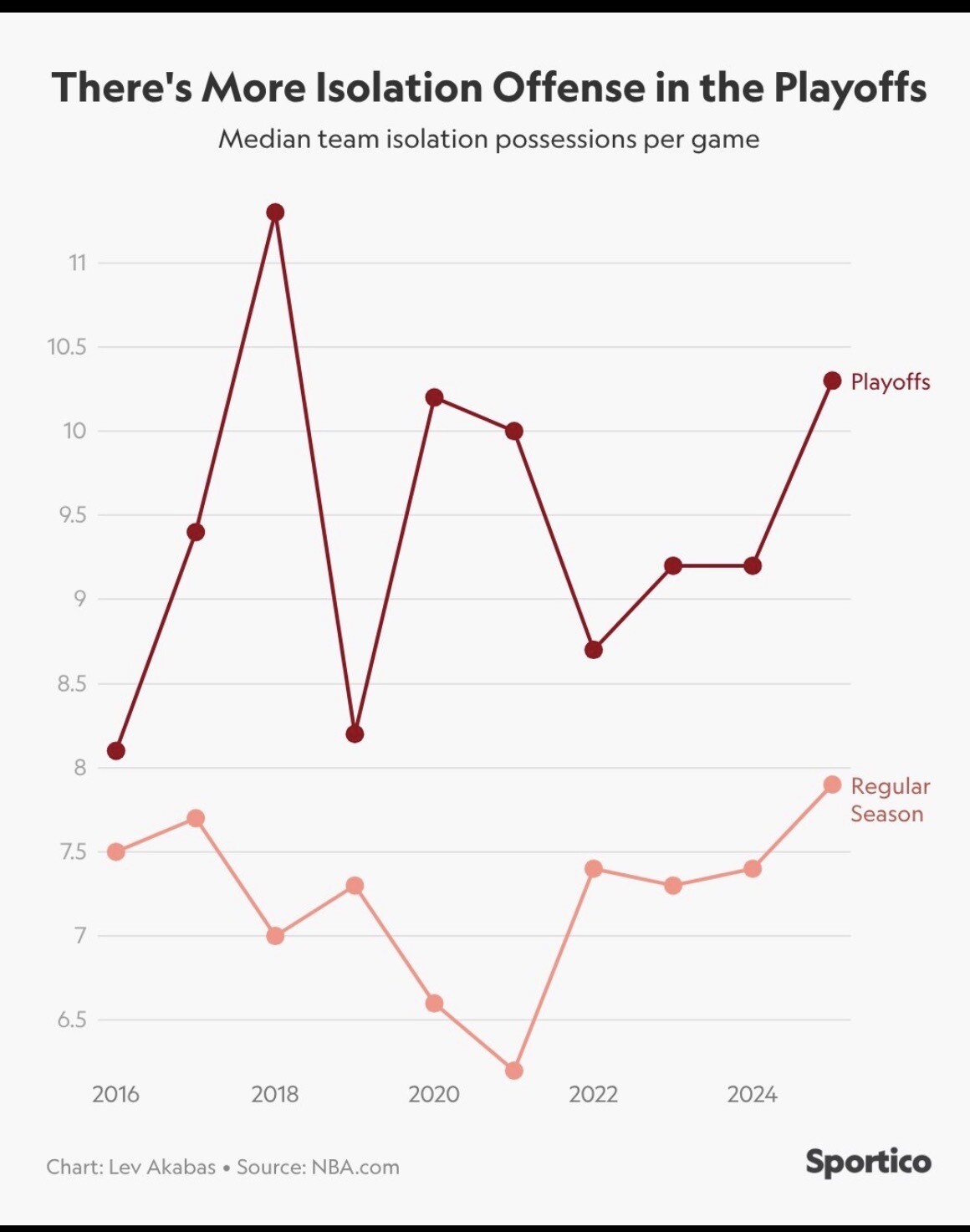 2010년 이후 NBA 플레이오프 240개 팀(2020 버블 기간 팀 제외) 중 거의 4분의 3(73%)이 플레이오프 동안 3점슛 성공률이 정규 시즌보다 낮았다