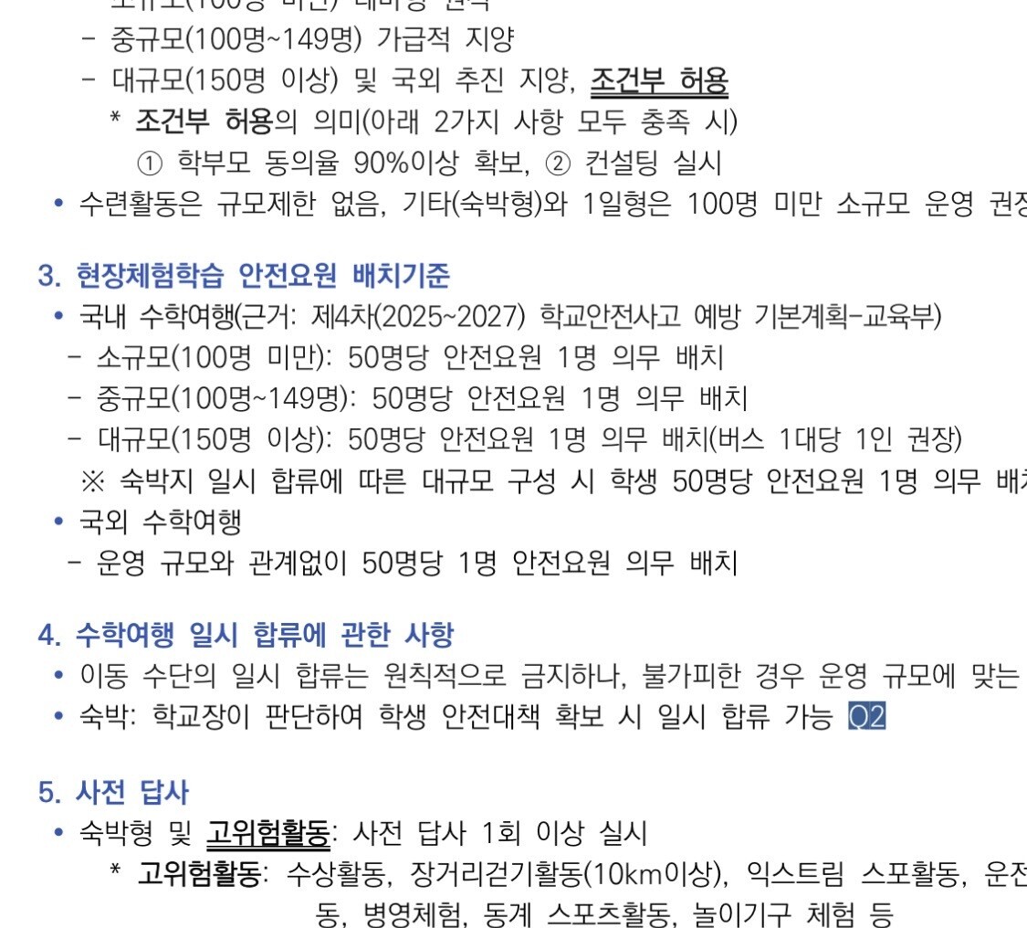 당국에서 정한 안전요원 의무 기준이 학생 50명당 1인입니다