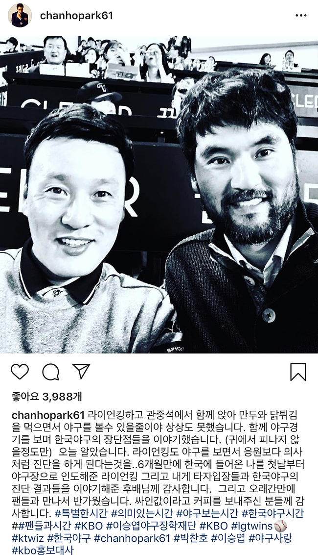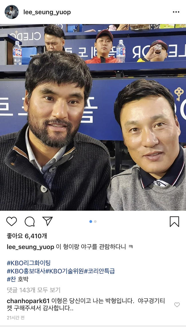 두 사람이 담긴 셀카 사진. 그러나 다른 표현(량) 진짜 찬호 형님은.. 이승엽 선수 인스타에 남긴 아재 개그 댓글까지..