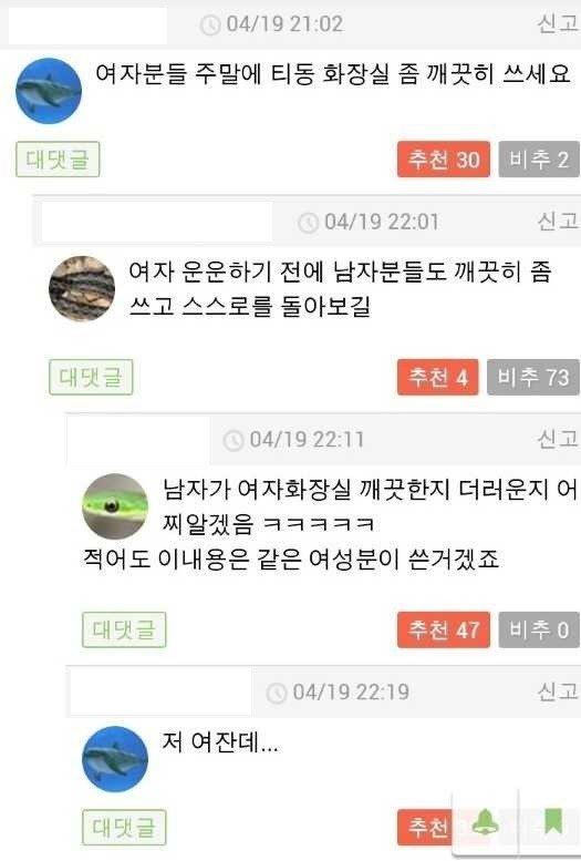 공용 화장실에 관해 말하는데 여자화장실을 더럽게 사용하는지 어떤지 남자는 알 방법이 없죠. 따라서 화장실 깨끗하게 쓰라고 따질 이유도 없구요. 5초만 생각해봐도 알만한 문제 같은데요.