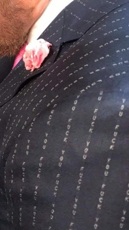 프래스 컨퍼런스에서 메이워더 옆에 두고 말했네요 이 수트 줌인 해보면 FU라고 써있다고
