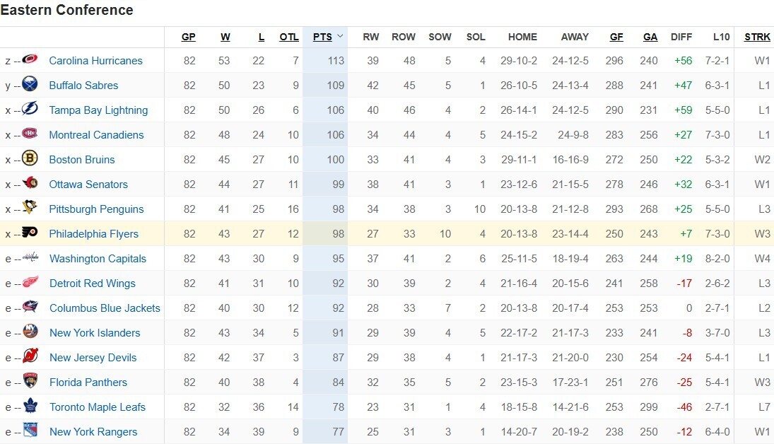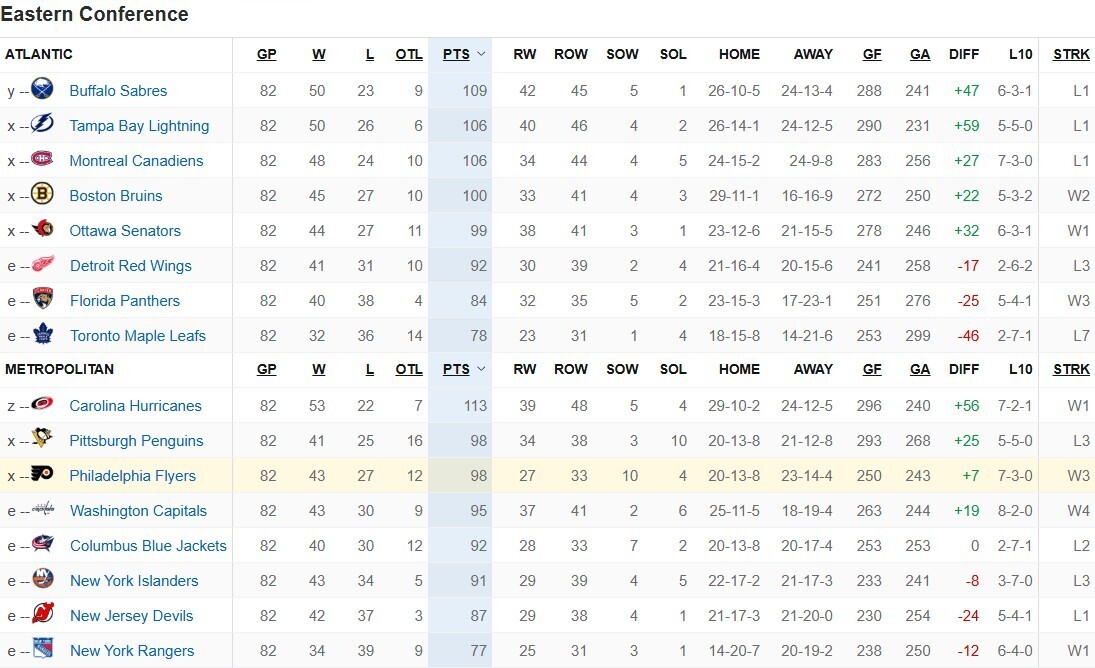 - 애틀랜틱 디비전 & 메트로폴리탄 디비전 순위 -
