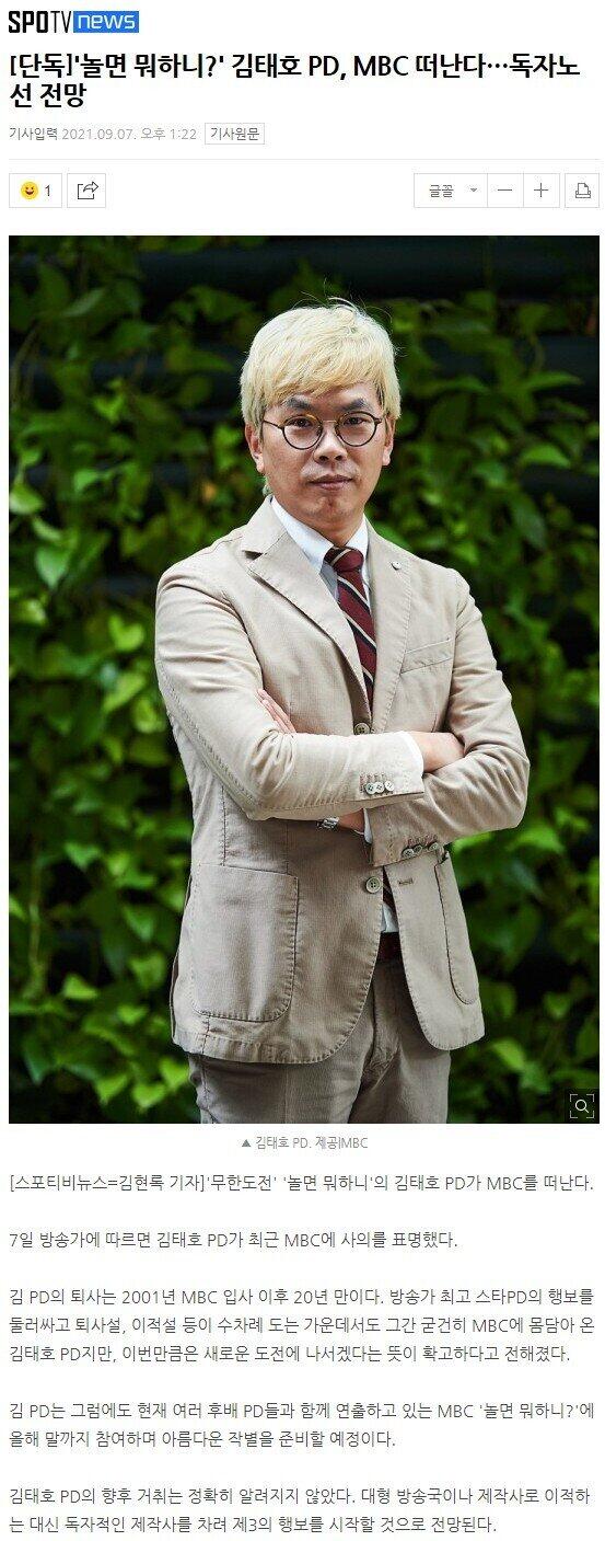 오늘 시간이 많이 남아도는데다 근처에 있는 내용들이라 댓글 많이 달고 있네요. 다른 PD들과 달리 모종(거액인지는 모르겠음)의 투자를 받아 납품하는 제작사 차리는 방향인데요. MBC 출신들이 중추인 카카오TV와 많은 이야기 진행됐고, 안테나와도 많은 이야기 진행됐다는 게 업계 후문이네요!