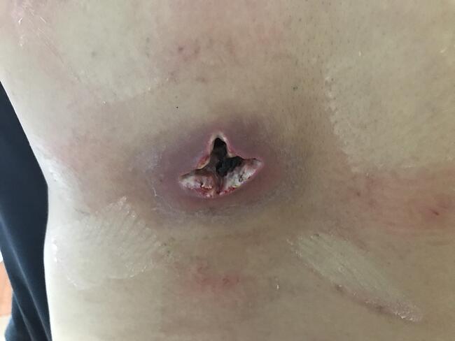 인서울 대학병원 성형외과 재직중입니다. ruptured epidermal cyst로 I & D (절개 및 배농) 시행하셨는데, 가로나 세로나 아닌 십자 모양으로 절개를 한 상태로 흉터 및 주변 피부 조직의 부분 괴사는 더 심할 것으로 보입니다. 닫지 않고 열어둔 이유는 아직 내부에 염증이 많거나, 낭종의 주머니 (pocket)이 커서 그럴 가능성이 높고, 실제로 사진을 봐도 아직 염증 및 괴사 조직이 완전히 제거되지 않았습니다.