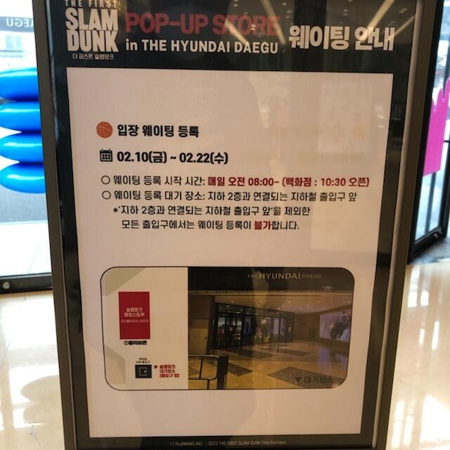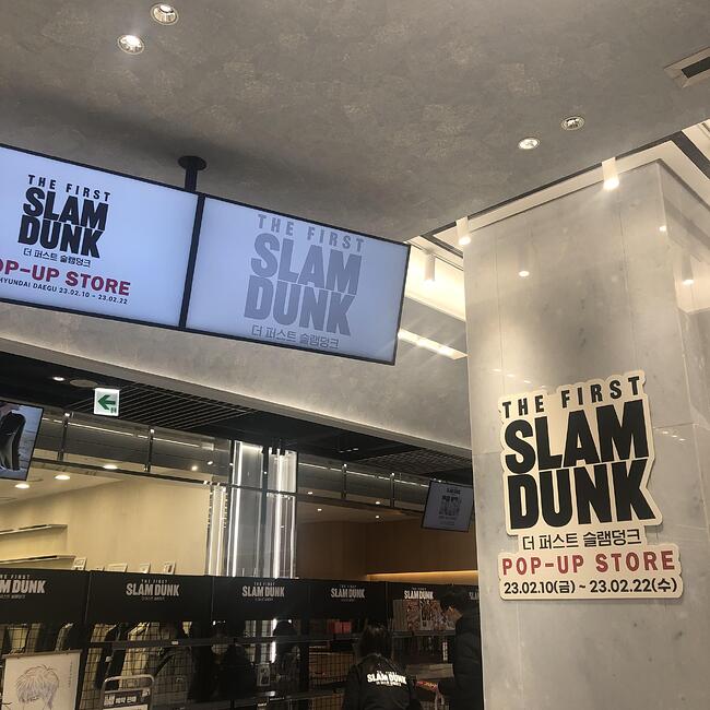 일보러 현백 갔다가 대구 현대백화점이 더현대 대구로 리뉴얼했다고 해서 지하까지 내려갔는데 뙇!! 슬램덩크 팝업 스토어가 있네요?? 서울에서만 하는줄 알았는데 신기했습니다. 마침 오늘(10일) 오픈해서 22일까지 한다고 합니다. 입장권 나눠주는 곳 줄이 길어서 들어가보진 못하겠고 그냥 밖에서 구경만 해야 될 것 같아요. 관심 있으신 분 구경오세요ㅎㅎ * 지하 2층에 세군데 정도 나눠져 있습니다.