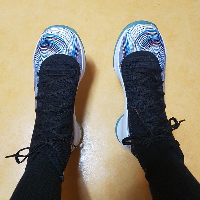일단 신발 신는게 칼발인 저한테도 꽤 어렵습니다; KD9 일반 버전 만큼 극악은 아닌데 발목 부분이 처음부터 막 늘어나고 그러는게 아니여서 끈을 살짝 풀고, 발을 약간 돌리듯이(?) 신으니까 신을만 하더군요. 착용하면 어퍼의 니트소재가 양말을 신고 있는 것 처럼 편안하게 발을 잡아줍니다. 굳이 끈을 꽉 묶을 필요도 없어보이구요. 다만 추가적인 발목지지가 필요하시다면 보호대 착용은 필수겠지요.
