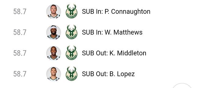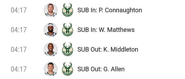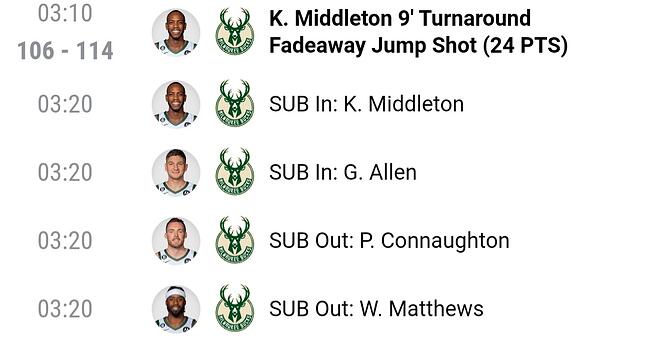 크리스미들턴이 복귀 후 벤치에서 20분내외로 출전시간조절을 받고 있는데요. 4쿼터 교체상황을 보시면 1. 6분26초 남기고 다시 투입 2. 4분17초 남기고 벤치행 3. 3분20초 남기고 다시 투입 4. 58초 남기고 벤치행으로 오늘경기 종료. 총 출전시간이 21분으로 끝났습니다. 보통 팀상황이 어려우면 몇분정도 더 뛰게하는 경우가 많은데요. 근데 짧게 짧게 2분뛰고, 1분쉬고, 다시 2분20초 뛰고 칼같네요.